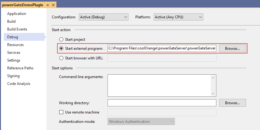 The project is configured to launch powerGateServer in a Console when clicking the Start button or pressing F5. (Requires Visual Studio to be started with elevated permissions)