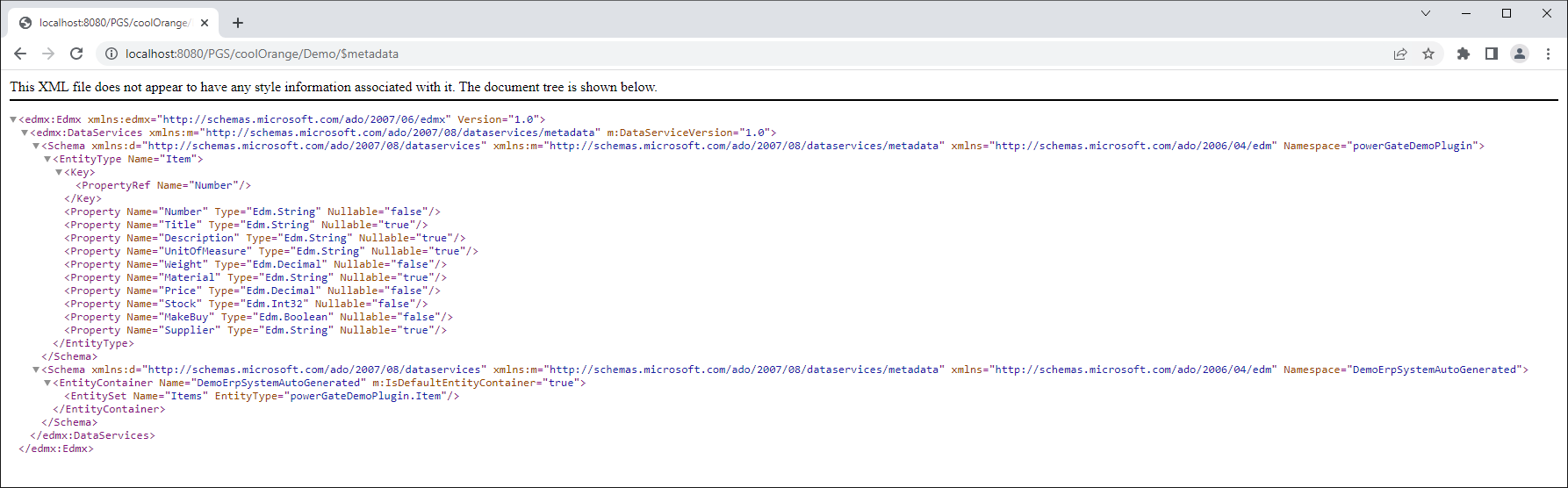 To test that the service was loaded open the metadata url (e.g. http://localhost:8080/PGS/coolOrange/Demo/$metadata) in a web browser.