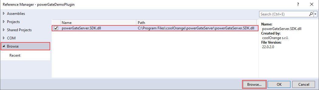 Add a reference to the powerGateServer.SDK.dll assembly from the powerGateServer installation directory:
