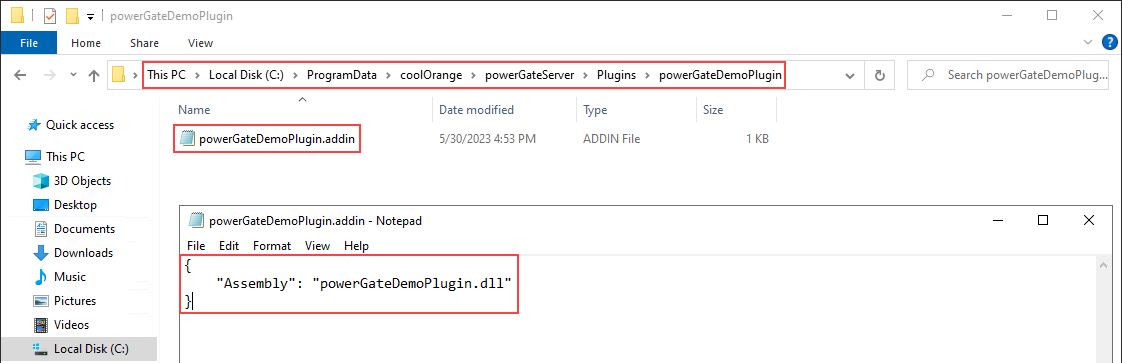 Within that directory create a addin file e.g.: powerGateDemoPlugin.addin . The content of the JSON file contains the path to the assembly.