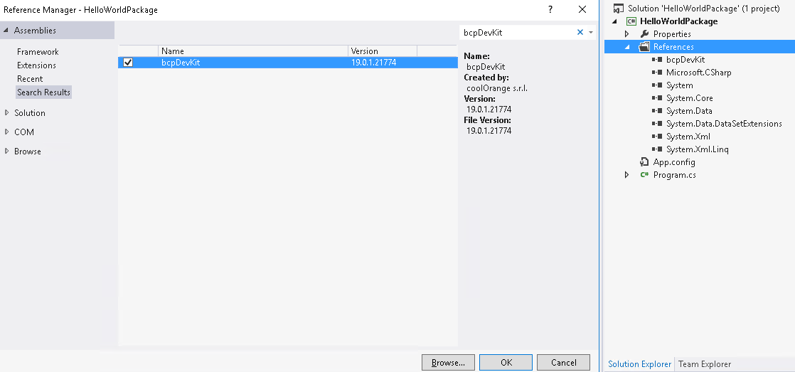 Search for the assembly “bcpDevKit” in Assemblies-tab and add it to your project.