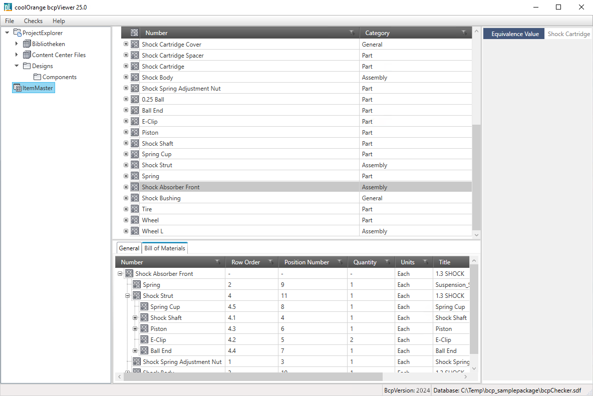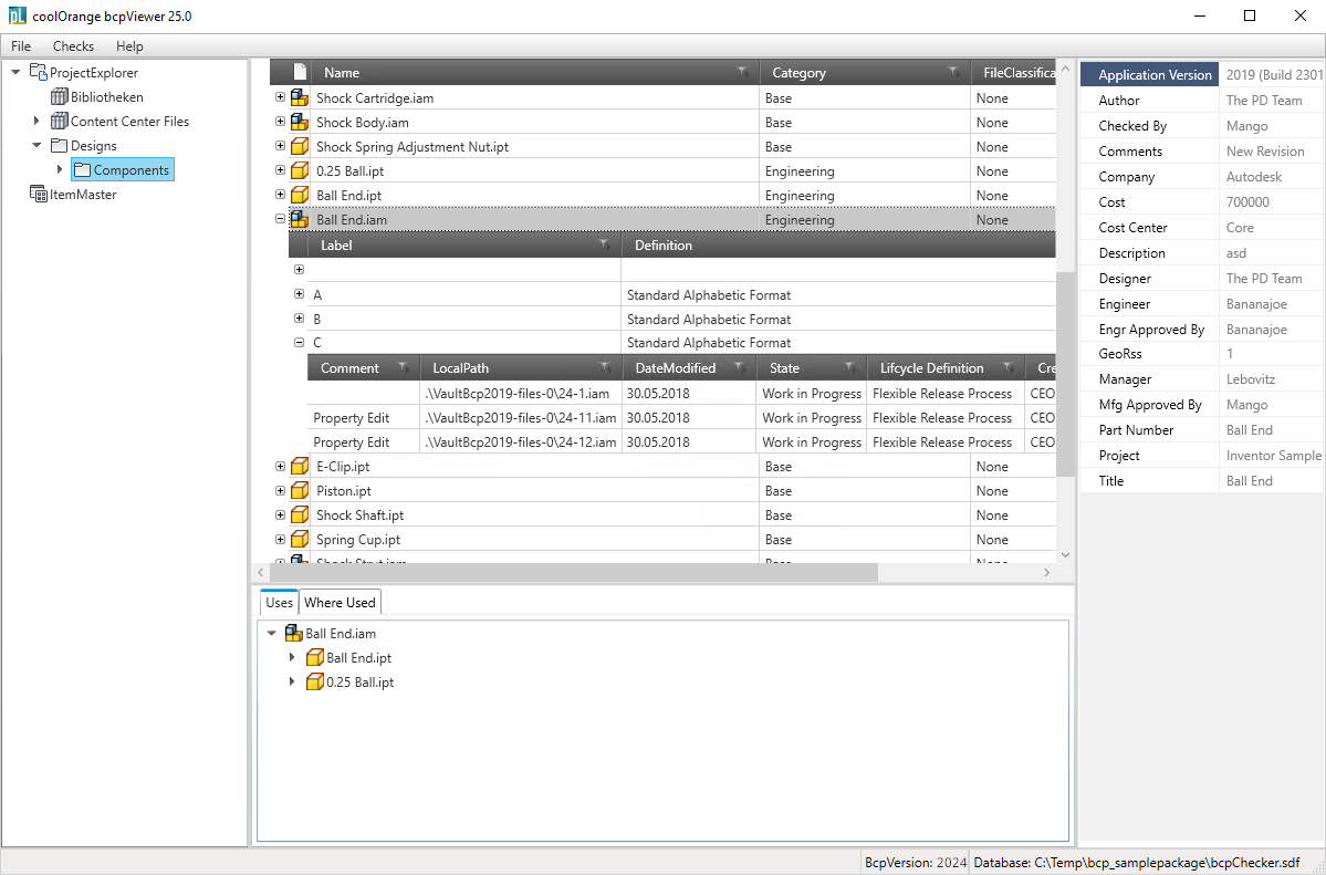 After selecting an item, you get informations about the associated files and the Bill of Material.