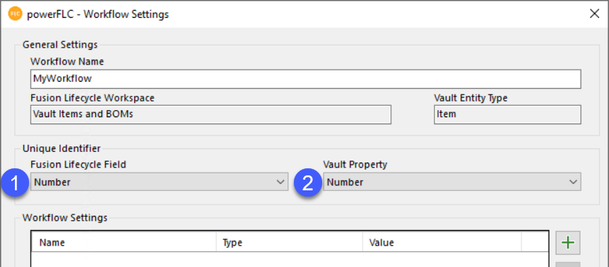 For the Fusion 360 Manage Workspace and the Vault Entity the unique field must be chosen, that is used to identify the Fusion 360 Manage Item with the according Vault Entity and vice versa.