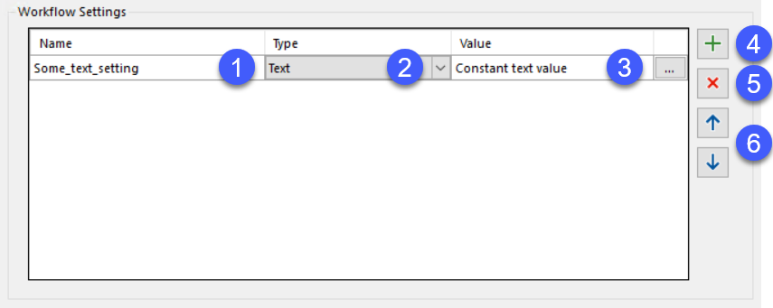 The Workflow Settings section allows to create, modify and remove settings. These settings are retrieved in the workflow (e.g. the powerJobs Job) and can have constant or dynamic values.