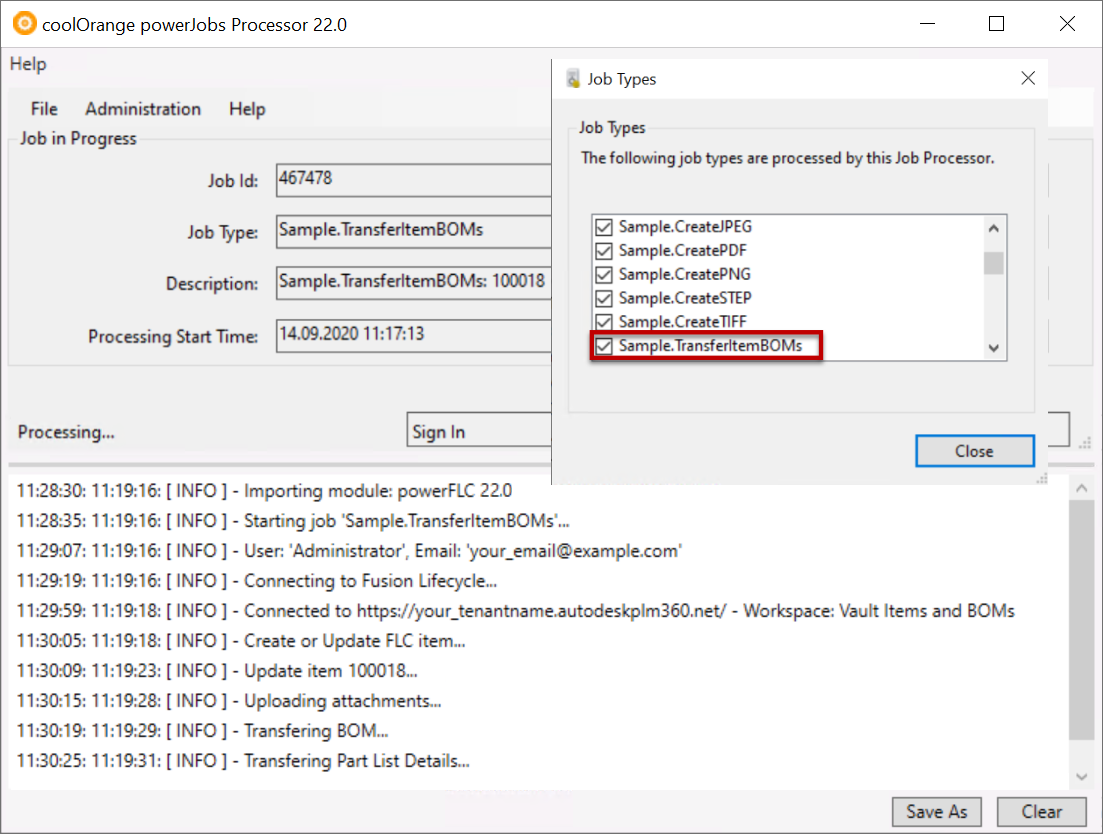 powerPLM (powerFLC) is delivered with two sample workflow jobs Transfer Item BOMs and Change Management. Their purpose is help people getting started with creating their own workflows based on powerJobs Processor.