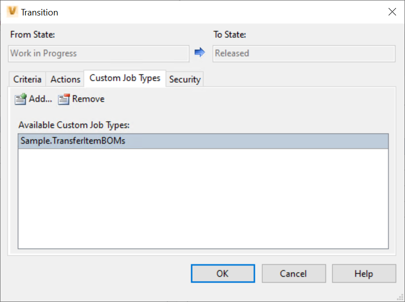 In order to execute the workflow job on Vault Item lifecycle changes to a ‘Released’ state, each single Vault lifecycle state transition must be extended to trigger a job of the type “Sample.TransferItemBOMs”: