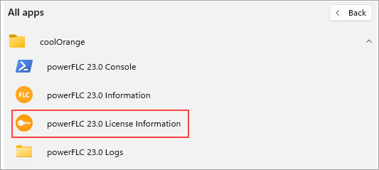 Open the Start Menu and navigate to “All Apps → coolOrange → powerFLC 23.0 License Information” shortcut.