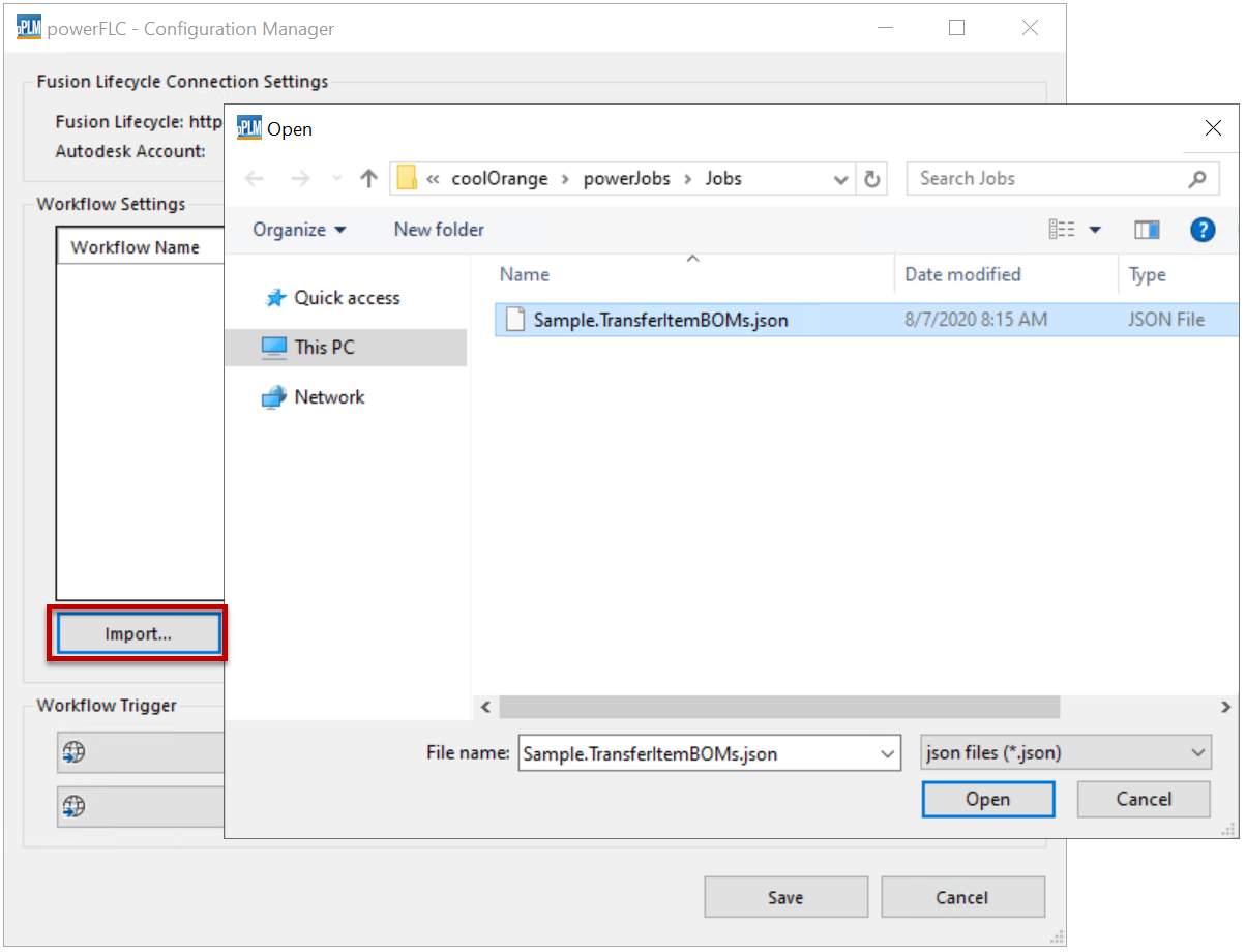 Import the configuration using following file: %ProgramData%\coolOrange\powerJobs\Jobs\Sample.TransferItemBOMs.json.