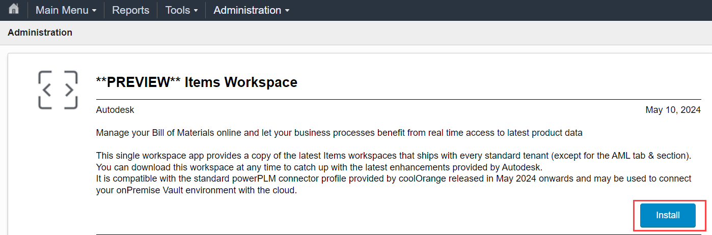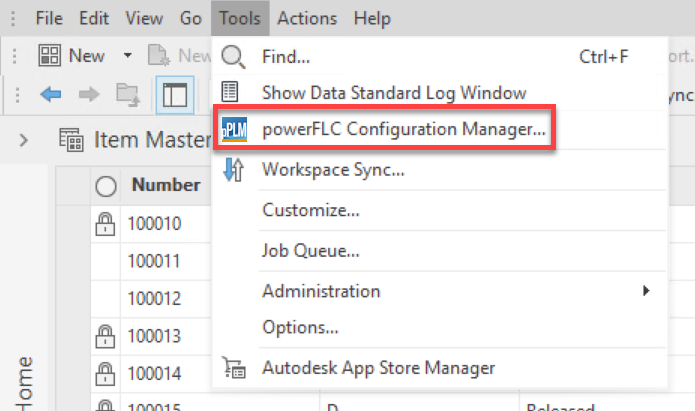 Autodesk’s default workspace “Items” is already configured to align with the Transfer Item BOMs workflow.