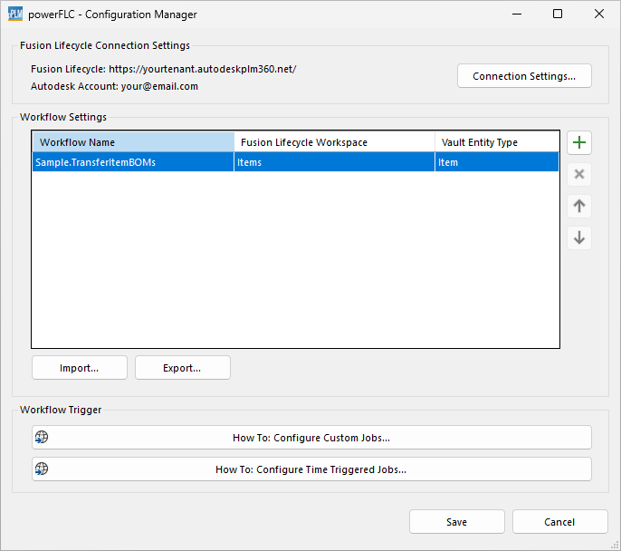 Import the configuration using following file: %ProgramData%\coolOrange\powerJobs\Jobs\Sample.TransferItemBOMs.json.
