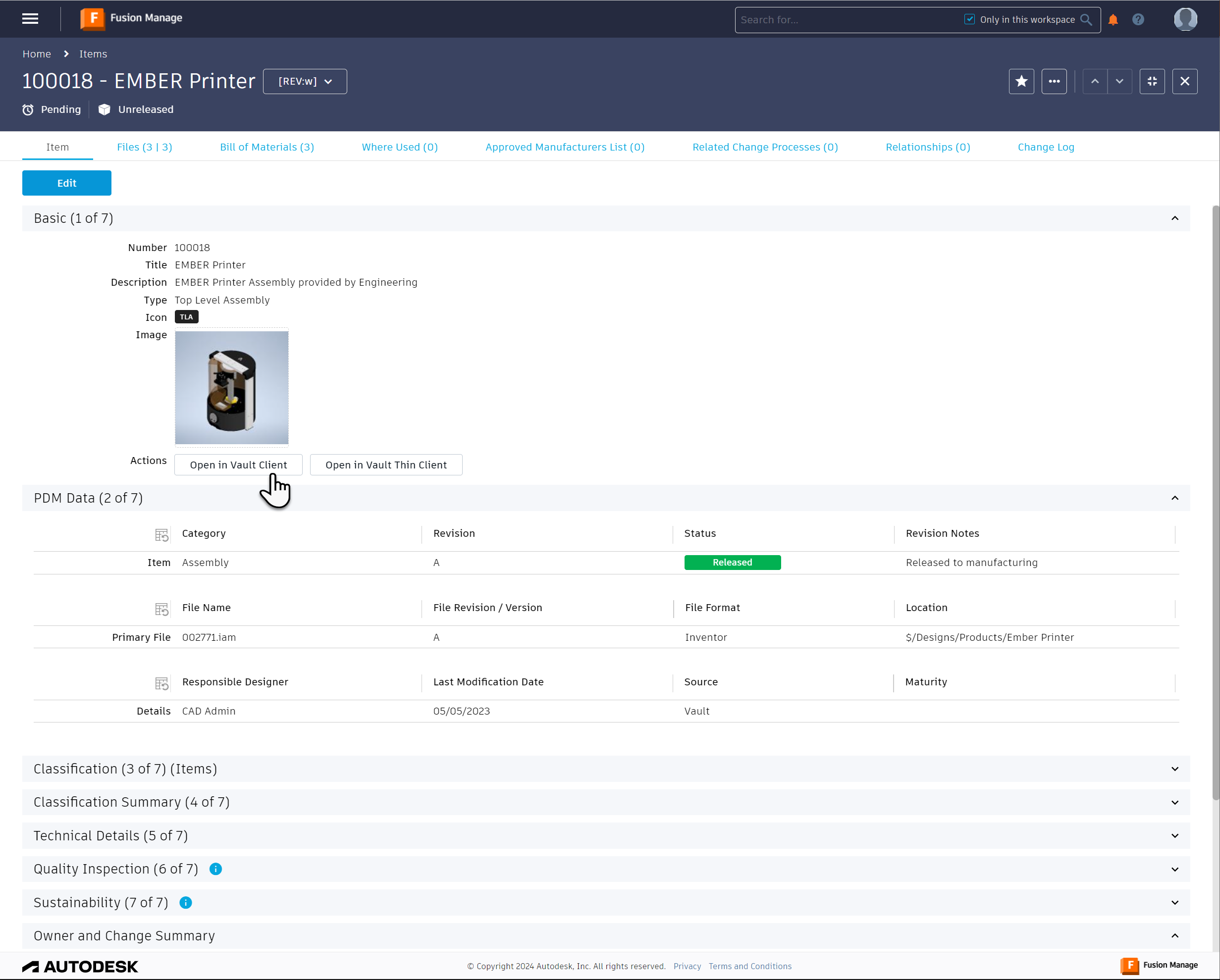 After the Job Processor has finished processing the Job, the item and its mapped Vault Properties, Attachments and Bill of Materials should habe been successfully transferred to your “Items” workspace in Fusion Manage: