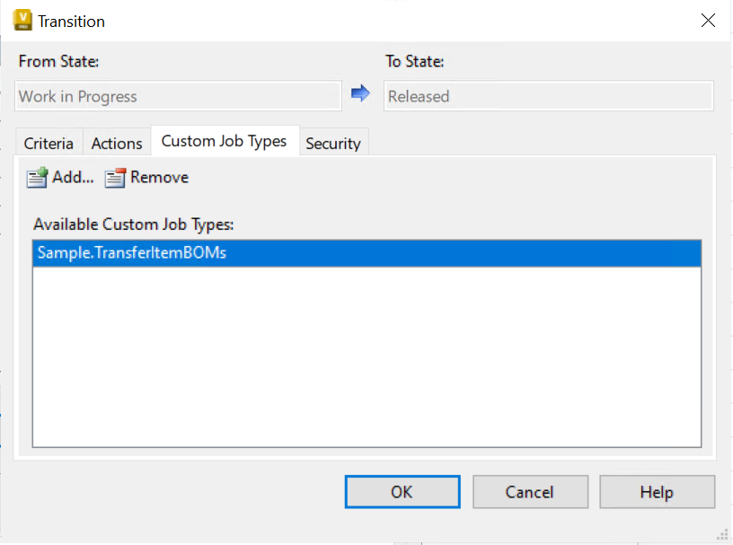 Configure a Vault lifecycle state transition for items to trigger the Job Type: Sample.TransferItemBOMs on a lifecycle change.