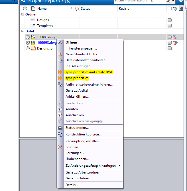 Sync properties and Create DWF menu item will add the same job as above to the job queue for the selected files, folders and custom objects. Additionally it will create the DWF for the files. Only files with following extensions .iam, .idw, .dwg, .ipn, .ipt are supported.